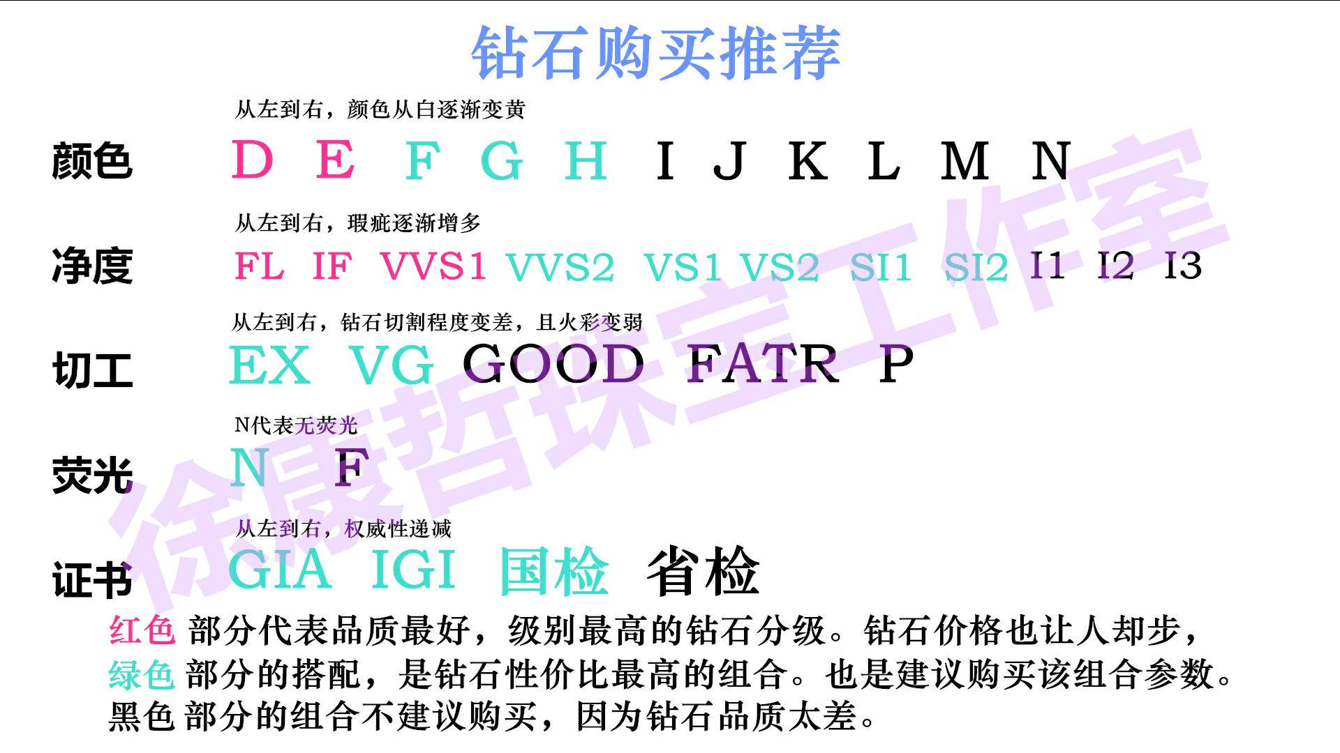 G(很白)、H(白)、I-J(较白)、K-L(次白)、M-N(一级微黄)、O-P(二级微黄),剩下的就是三级微黄,黄或者棕。
