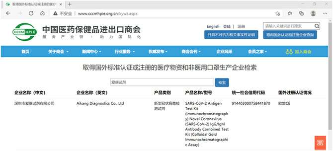 深圳爱康自主研发的新型冠状病毒 (SARS-CoV-2) IgG/IgM抗体联合检测试剂盒和新型冠状病毒 (SARS-CoV-2) 抗原检测试剂盒,按照欧盟体外诊断医疗器械指令98/97/EC相关规定及CE合格认证程序要求,完成了欧盟CE准入认证,并于近期进入了中国医药保健品进出口商会官网公布的取得国外标准认证或注册的医疗物资生产企业清单(简称医保商会白名单),进一步参与到国际抗疫之中!
